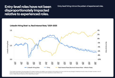 Opvallend: instapbanen nemen ongeveer even sterk af als functies voor ervaren professionals. Dit suggereert dat AI starters niet uitzonderlijk hard treft. LinkedIn wijst eerder op een nasleep van de grote arbeidsmarktverschuivingen na corona als verklaring.