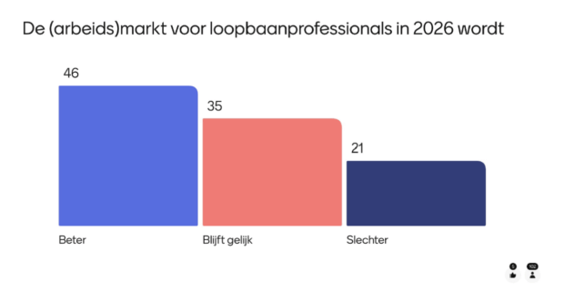 Maar vraag diezelfde professionals naar hun eigen markt, en het beeld kantelt volledig. Maar liefst 46% verwacht dat de markt voor loopbaanprofessionals beter wordt, tegenover slechts 21% die verslechtering voorziet. Deze kloof suggereert dat de behoefte aan loopbaanbegeleiding juist toeneemt in een complexer wordende arbeidsmarkt.