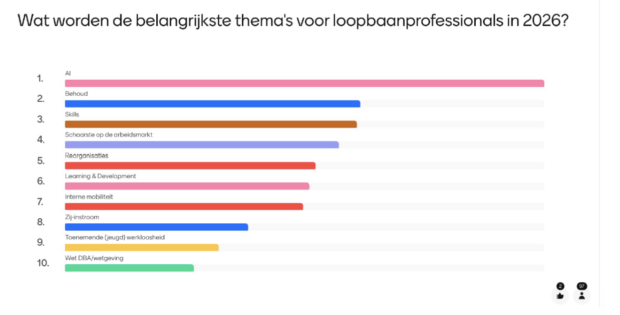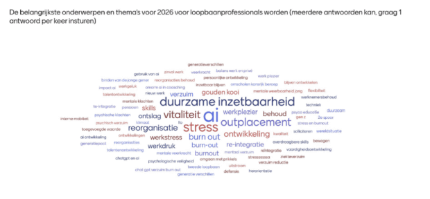 Naast AI domineren thema’s rondom mentaal welzijn het toekomstbeeld. In de word cloud zijn ‘stress’, ‘burn-out’, ‘duurzame inzetbaarheid’ en ‘vitaliteit’ prominent aanwezig. Dit wordt onderstreept door de top 10, waar ‘behoud’ op de tweede plaats staat, direct gevolgd door ‘skills’ en ‘schaarste op de arbeidsmarkt’.