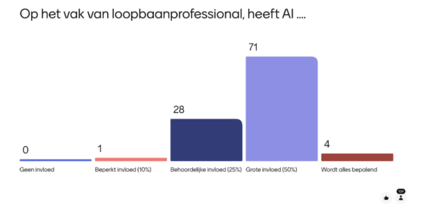 Nog indrukwekkender is de verwachte impact: 71% van de loopbaanprofessionals verwacht dat AI een grote invloed (50%) zal hebben op hun vak, gevolgd door 28% die een behoorlijke invloed (25%) voorziet. Slechts één respondent denkt dat AI beperkt invloed zal hebben, en niemand denkt dat het geen invloed heeft.